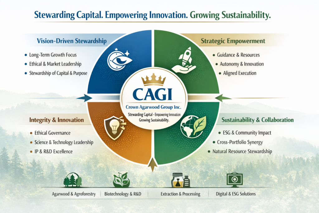 At the intersection of nature, science, and finance, Crown Agarwood Group Inc. represents a new model of holding company — one that recognizes sustainability as strategy, innovation as infrastructure, and capital as a responsibility.