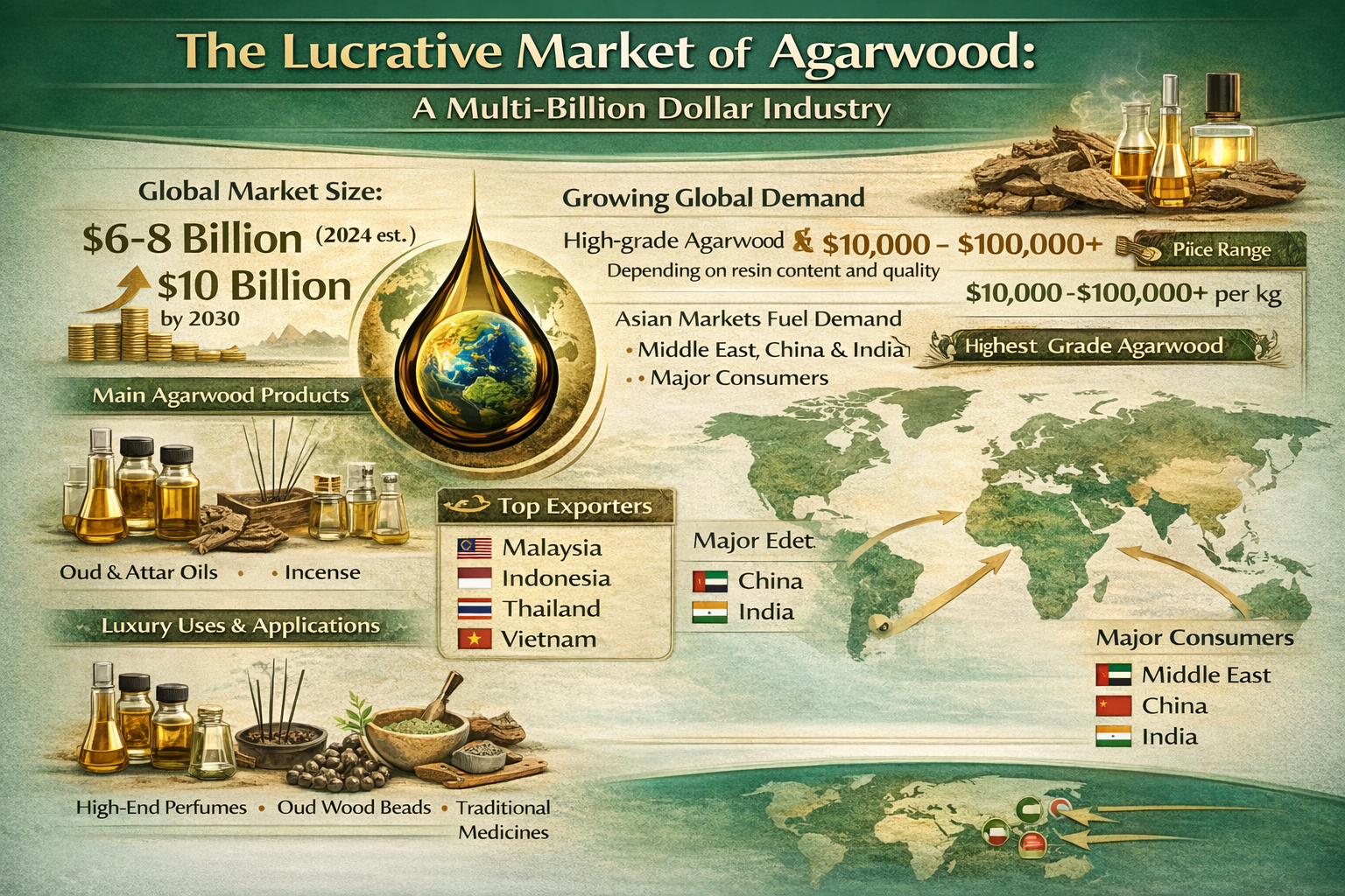 Agarwood, also known as “liquid gold” in the fragrance and luxury industries, is one of the most valuable natural commodities in the world. The global market for Agarwood and Oud-based products is growing rapidly, driven by high demand, limited supply, and increasing investment opportunities.